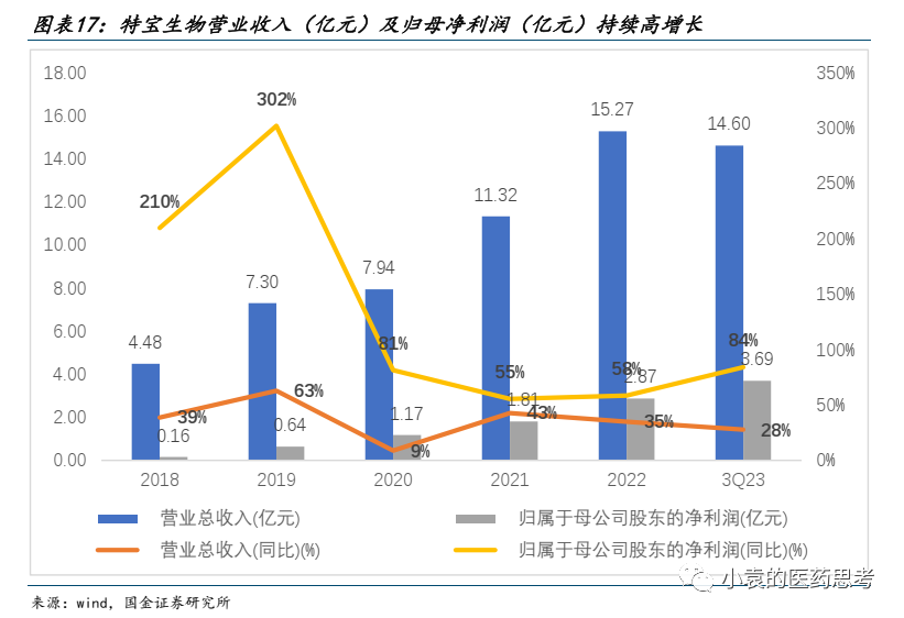 特宝生物2023年前三季度公司实现收入14.60亿元,同比+28%;实现归母净利润3.69亿元,同比+84%;实现扣非归母净利润4.11亿元,同比+69%。单季度看,公司2023Q3实现收入5.56亿元,同比+30%;实现归母净利润1.67亿元,同比+150%;扣非归母净利润1.78亿元,同比+92%。目前国内长效干扰素外资竞品罗氏派罗欣目前已逐步退出中国市场,派格宾已进入市场独占期,未来销售收入有望维持高速增长。