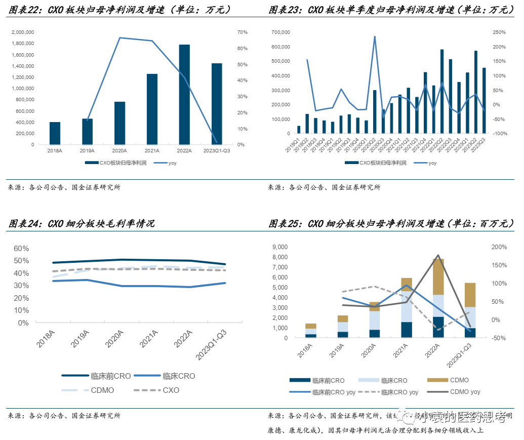 从细分领域来看,仍然维持临床CRO优于临床前CRO优于CDMO类业绩的规律。CXO板块中收入贡献占比最大的仍然是订单收入规模大的CDMO业务,具体来看,CDMO>临床前CRO>临床CRO。三个细分领域剔除特定大订单影响前的营收增速:临床CRO(+10.82%)>临床前CRO(+10.56%)>CDMO(-1.56%)。剔除特定大订单影响后,CDMO板块营收增长恢复明显:CDMO(+35.85%)>临床CRO(+32.44%)>临床前CRO(+8.87%)。