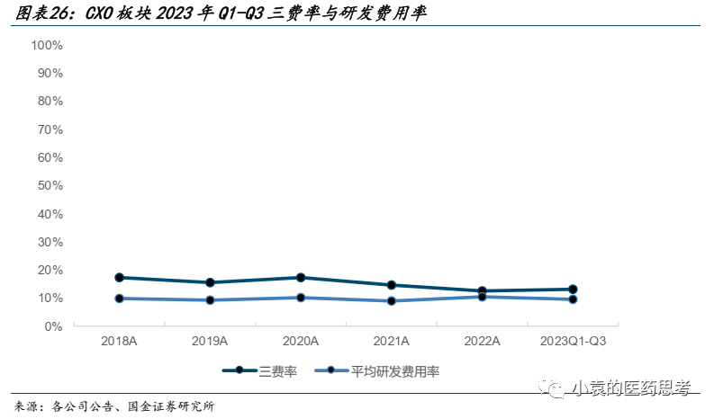费用端:三费率维持平稳,汇兑收益影响盈利。2023年Q1-Q3,CXO板块公司平均三费率为13.12%,平均研发费用率为9.51%,基本与以前持平。