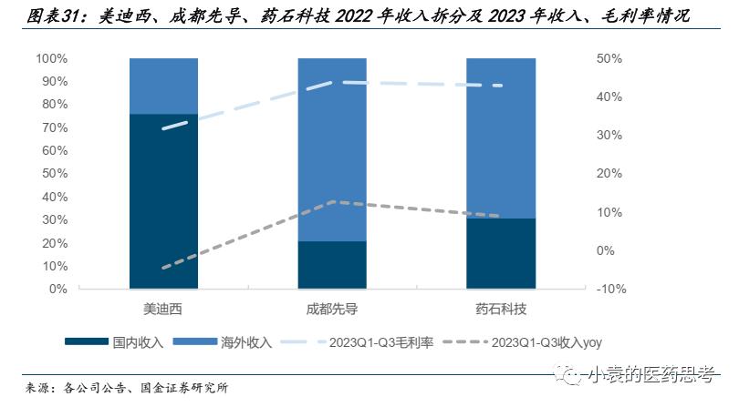 海外需求回复弹性大于国内。医药投融资环境对国内药企的扰动大于国外,同时海外CXO渗透率高于国内,导致海外收入占比较高的CRO企业恢复较快。发现以海外收入为主的成都先导、药石科技2023年前三季度表现较好,收入增长超过9%,且毛利率与2022年相比维持较好水平。我们认为,出海战略推进顺利、海外收入占比高的CRO企业将率先在需求修复中受益。