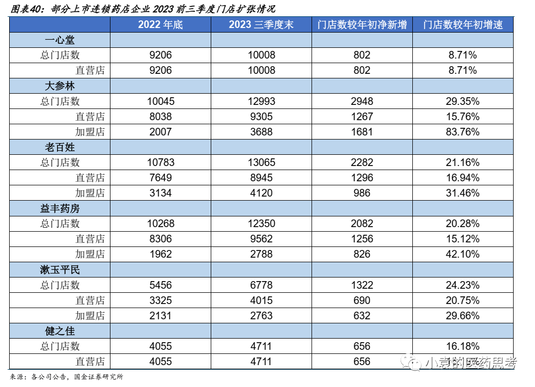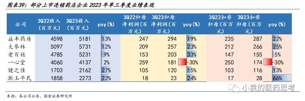 整体来看,上市连锁药店企业2023年前三季度收入和利润增长稳健,但由于各地门诊统筹政策推动速度有区别,局部市场节奏和形势有差异,增长速度有一定差距。