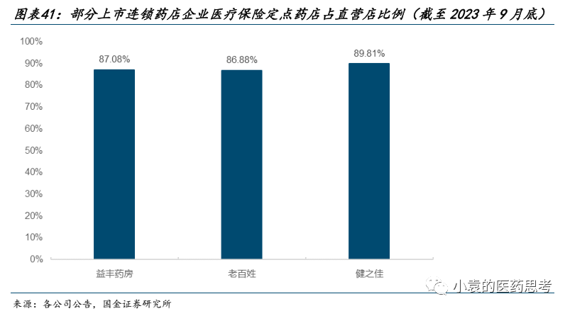 获取医保资格是各家门店承接处方外流的重要条件。截至2023H1,各家公司直营门店中,取得“医疗保险定点药店”资格的门店占比均超过85%。益丰药房、老百姓、健之佳三家公司披露了三季度末医保资质门店占比,分别达87.08%、86.88%、89.81%。门诊统筹门店数量方面,据各家企业三季度公告披露,一心堂已有735家门店接入门诊统筹,健之佳已有304家门店接入门诊统筹。老百姓目前门店覆盖的20个省份中,门诊统筹政策已落地14个省份,公司在全国拥有可互可刷门店总计2,893家,占公司总店数的22.14%。