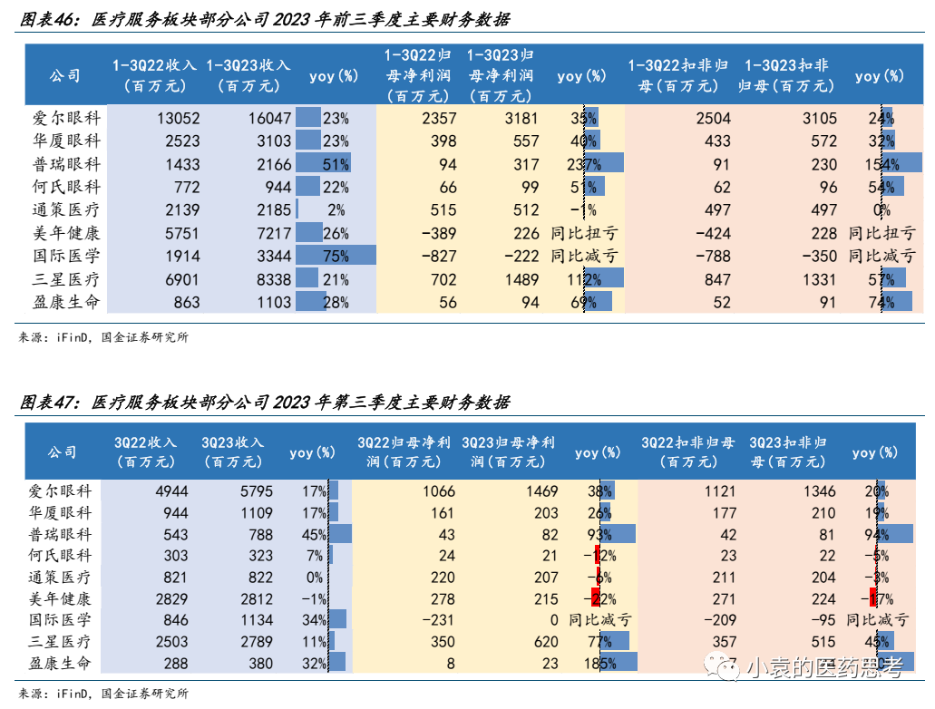 消费医疗旺季来临,板块业绩整体稳健。2023年Q3,多家医疗服务板块公司在收入端同比持续增长,虽然部分公司在利润端有所波动,但前三季度,医疗服务板块公司总体仍保持收入、利润双增长趋势,其中眼科赛道持续表现亮眼。