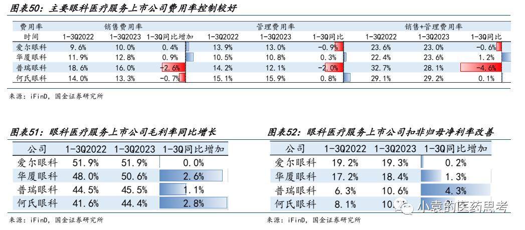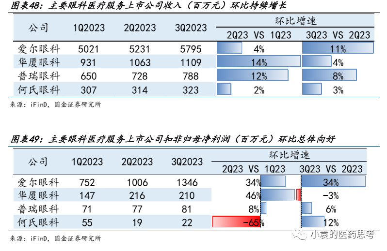 收入端,2023年前三季度主要眼科医疗服务上市公司环比维持增长态势。在去年Q4低基数的情况下,全年有望实现稳健增长。