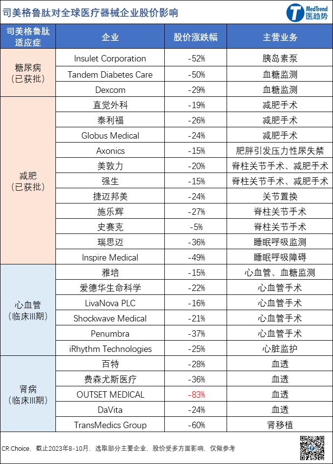 此消彼长。司美格鲁肽的成功,引发了投资者未来潜在医疗器械终端患者人数骤降的担忧。截止2023年10月底,全球受到“减肥神药”影响的医疗器械企业已超25家——Q3财报季前后,这二十多家TOP医疗企业CEO/CFO都在会议上忙于回答投资者“减肥神药是否会影响业绩”的问题。