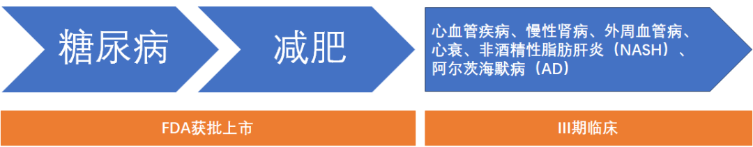 从上图可以,司美格鲁肽(GLP-1激动剂)的适应症已多达近10项,涉及肾脏、肝、脑、胃等各领域疾病。