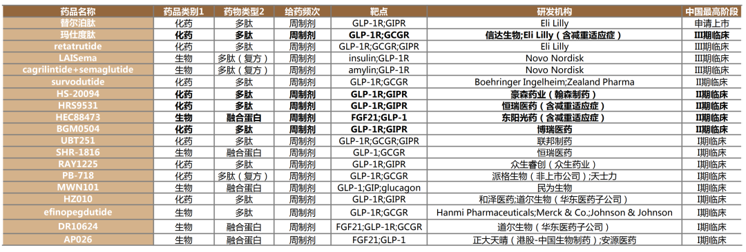 包括年底即将获批FDA的礼来Mounjaro,中期临床的辉瑞GLP-1口服药Danuglipron等),以及安进的GIPR抗体融合GLP-1新药AMG133早期数据惊艳,勃林格殷格翰的GLP-1R/GCGR双靶点激动剂survodutide也被看好。