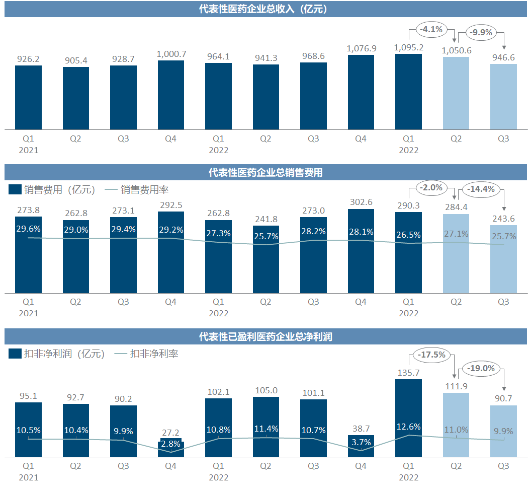 将全部55家企业A股头部药企的数据加总,我们非常明确地看到:反腐开始后营收出现显著下滑,Q3环比减少了超过100亿、幅度高达近10%,而此前两年同期都没有出现过类似情况;销售费用则出现了更加显著的压缩,销售费用率降到近年来最低水平25.7%;受收入总盘子缩水的影响,纵然销售费用率降低部分形成对冲,而管理费用和研发费用仍正常增长,导致净利润也出现环比滑坡,比往年同期也减少了5-10亿。