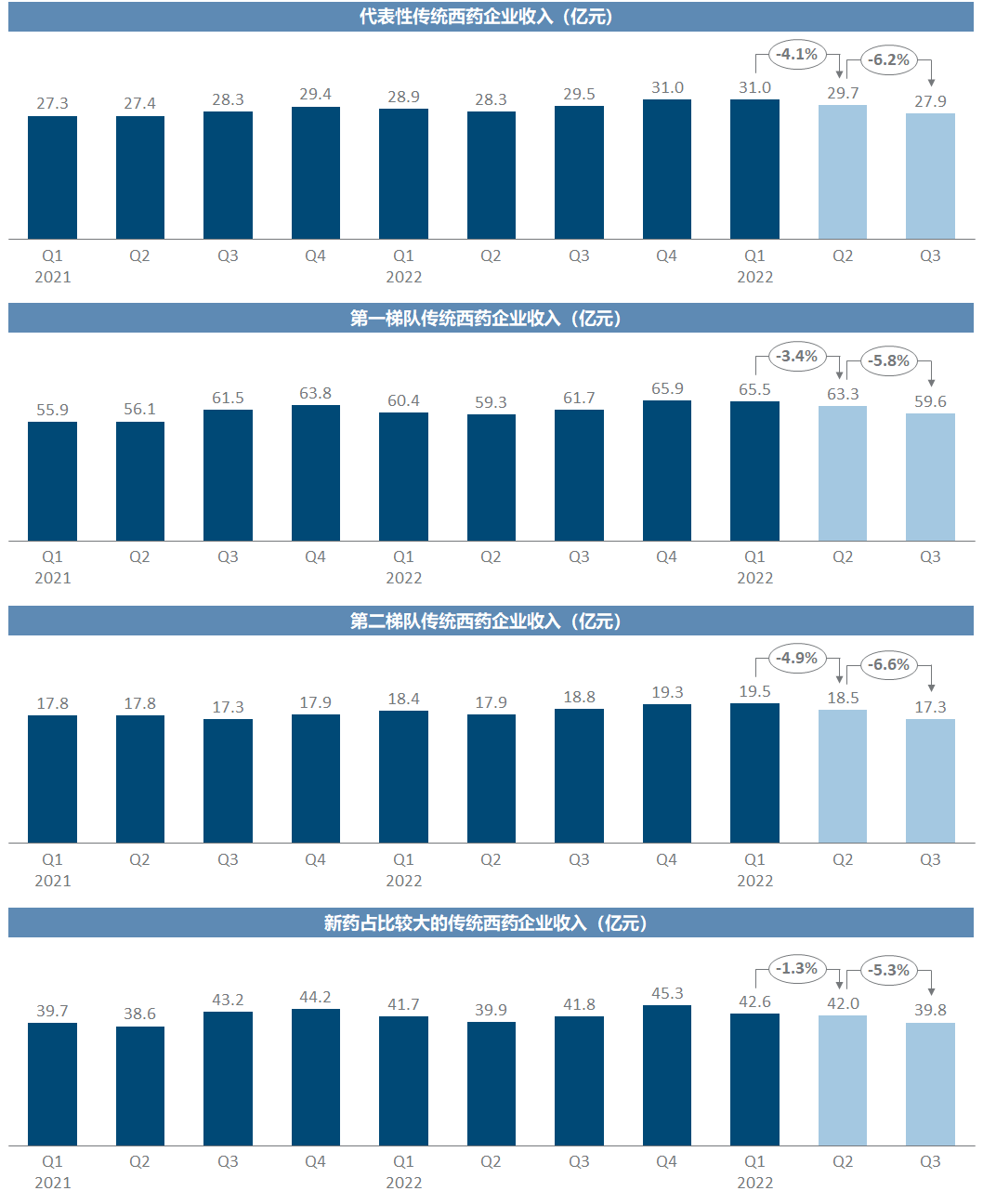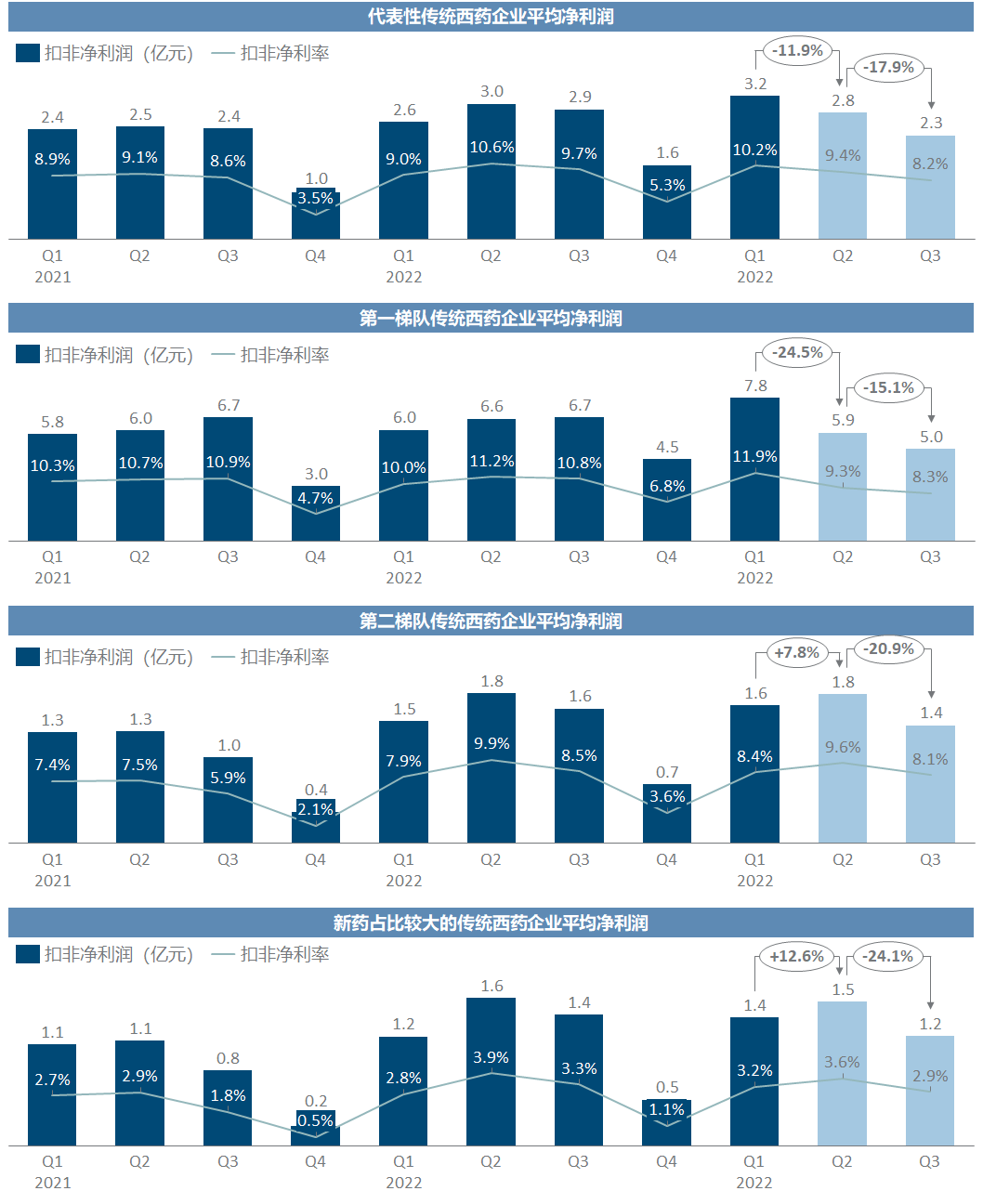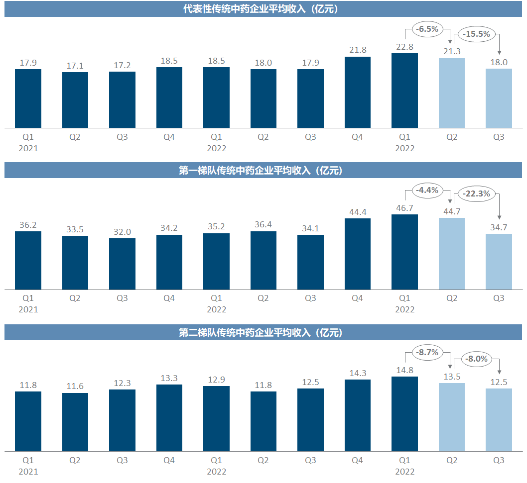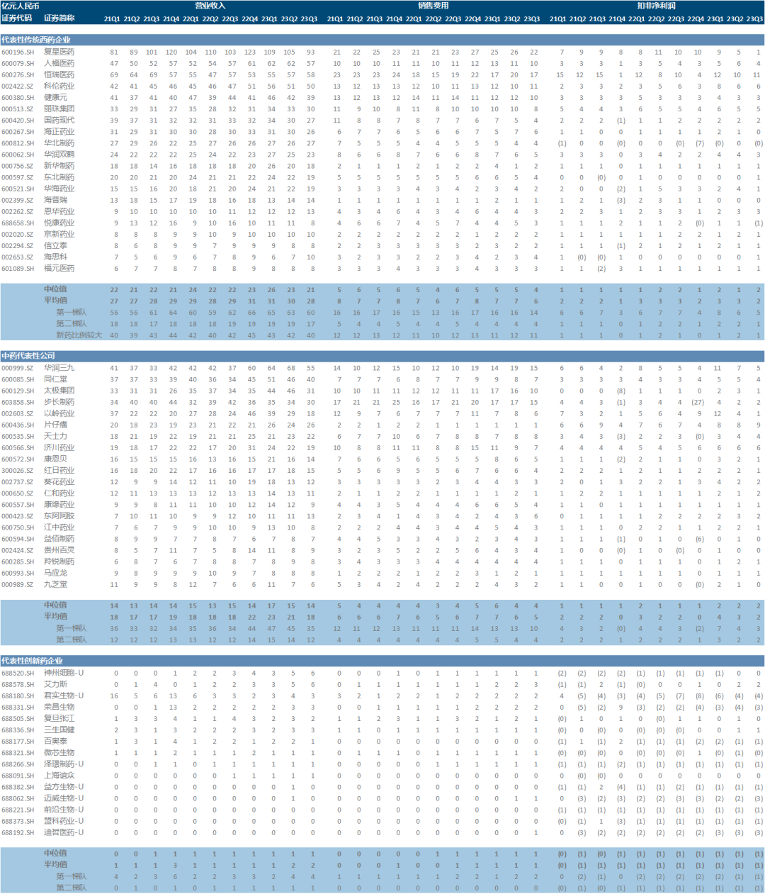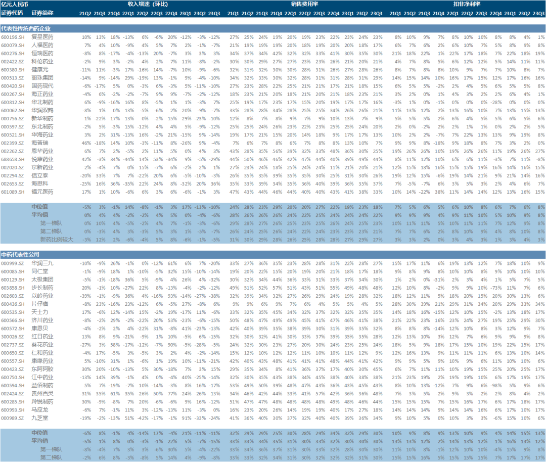 每一家企业当然有各自不同的剧情,但将一定样本量的企业进行加总,就可能抹平个性化特殊因素的影响,从而一定程度上反映出趋势性的规律。由于绝大多数港股上市公司并不披露三季报,我们只能遗憾地以A股医药上市公司为样本池,聚焦于医药工业占收入比例过半的公司,即排除以原料药、医药商业或其他医药产业链企业,例如新和成、国药控股、华东医药、白云山等;将药企分为三大类,分别是传统西药企业、传统中药企业和创新药企业,分别按照营收规模从大到小选取了20/20/15家,每一类中又定义营收规模前5名为第一梯队、其余为第二梯队。考察时间范围从2021年至今,尤其重点关注最近的2023年Q2和Q3,即医药反腐可能产生影响的时间范围(在动员会前事实上已有动作)。数据来源为Wind,具体数据见文末。
