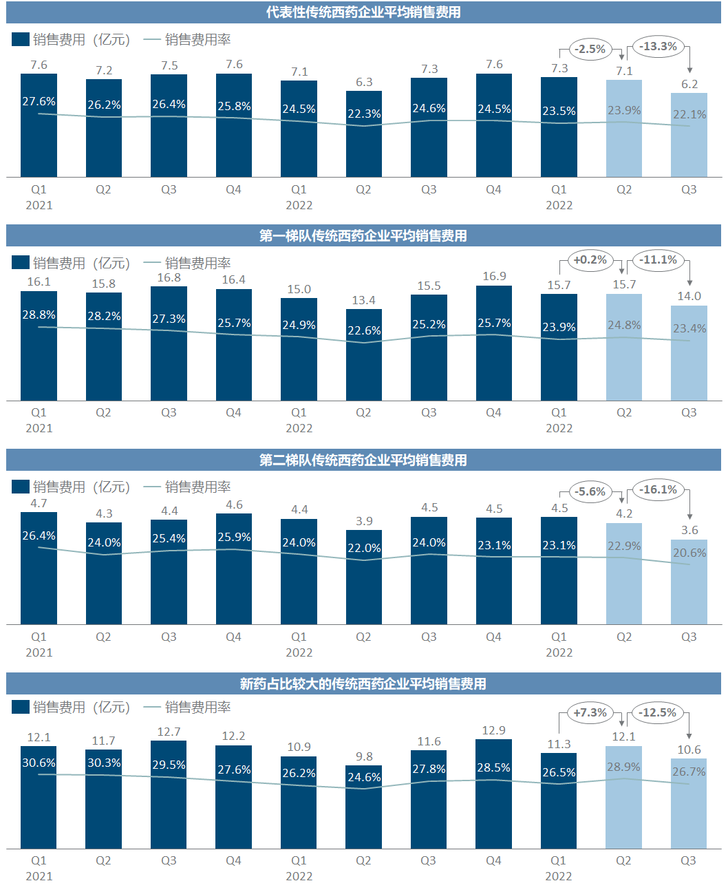 传统西药企业的销售费用率整体下降到历史最低的22%,并且越是头部企业和新药占比较高的企业(这二者范围有交集),销售费用控制的幅度越小,销售费用率虽有下降但不明显,而第二梯队那些纯仿制药企则销售费用环比减小了超过20%,印证了前文的判断,流向医疗环节的销售费用很多并不容易省掉,有不少是从曾经的简单粗暴仿制药带金转向了创新药的“学术活动”。