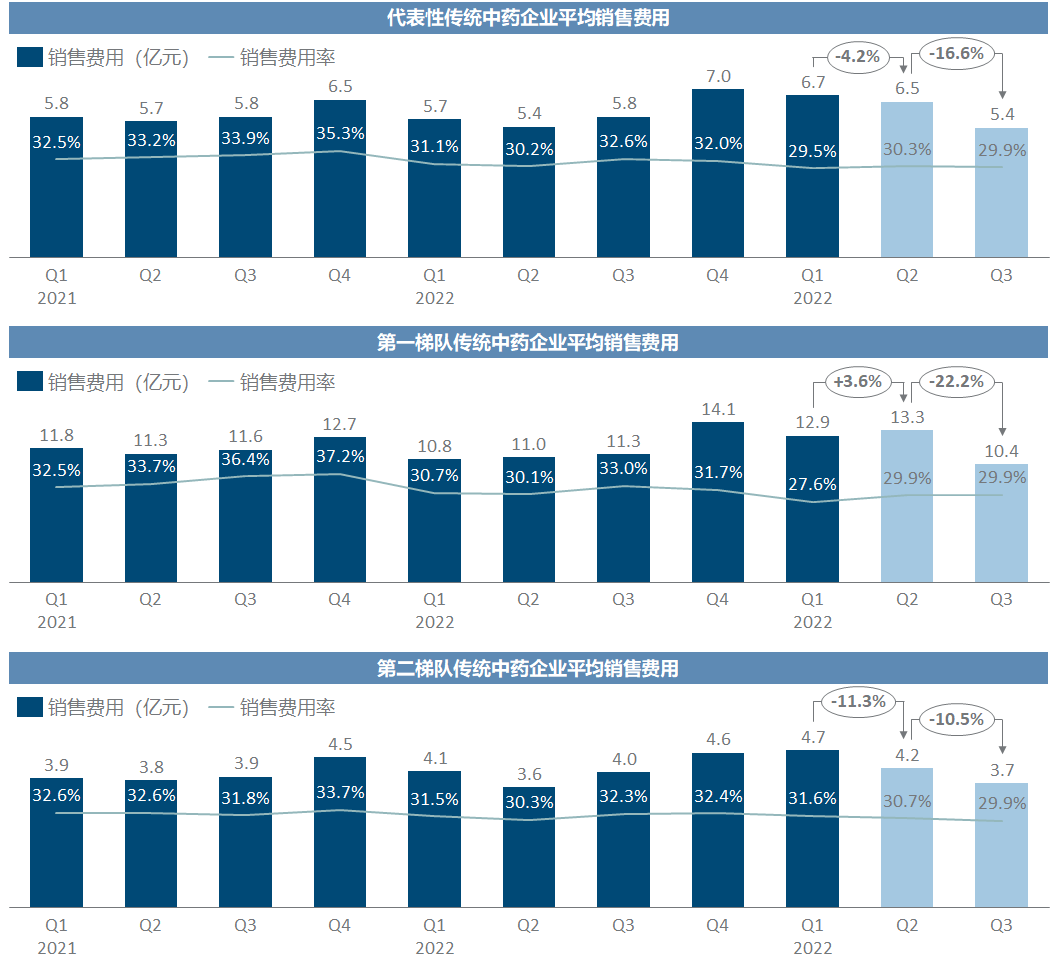 传统中药企业的平均营收环比降幅超过20%,显著高于西药的滑坡幅度,这无疑说明了在此之前中药对营销环节的重度依赖;并且有意思的是,第一梯队的缩水幅度反而显著大于第二梯队,也客观上反映了中药里越是大品种可能越依赖营销。