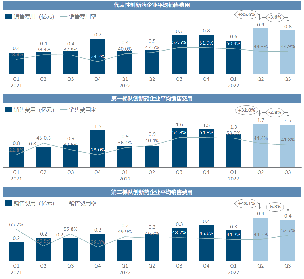 创新药企业的销售费用基本上缩减不多,毕竟都还在推广放量过程中,谁也舍不得就此放弃,差别在于第一梯队的药还能保持销售额不下滑,而第二梯队花着费用也卖不动、于是销售费用率不降反升。