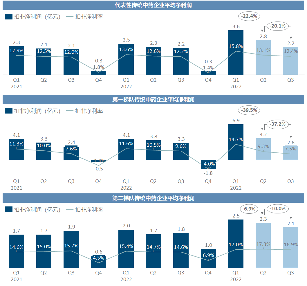 传统中药企业则完全是另一张图景,营收大幅缩水而销售费用率未能有效控制,第一梯队里的三九/太极/步长/以岭带头利润雪崩,反而第二梯队的平均净利润还能高于往年同期。
