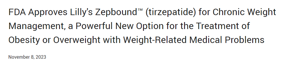 11月8日,Lilly公司表示,美国食品和药物管理局(FDA)批准了该公司的Zepbound™(tirzepatide,替尔泊肽)注射液,这标志着Lilly的tirzepatide正式进入慢性体重管理市场。这是首款也是唯一一款葡萄糖依赖性促胰岛素多肽(GIP)和胰高血糖素样肽-1(GLP-1)受体双重激动剂的肥胖症治疗药物。该药将于今年年底在美国上市,共有六种剂量,一个月的供应价格约为1060美元。据Lilly公司称,这一价格比诺和诺德公司用于减肥的GLP-1药物Wegovy 2.4mg剂量的上市价格低约20%。根据诺和诺德公司网站的资料,Wegovy 的上市价格为每包1,349.02美元。