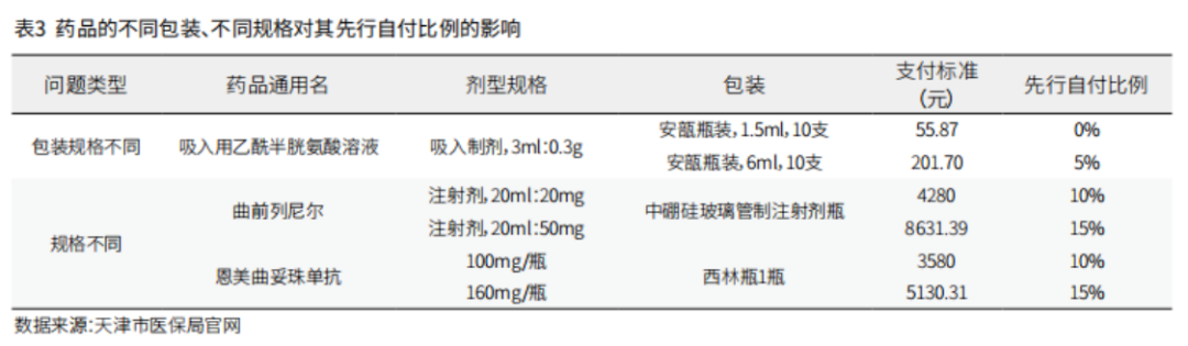 但此种方式在实践中有一定难度。一是需要建立完善的药品价格体系。以天津为例,该市为医保目录中的所有药品都制定了细化到厂家、剂量及装量的药品价格,而全国绝大多数地区尚不具备这一基础。二是如何划分药品的价格区间段需要科学依据支撑。如表2所示,天津和包头在价格段的划分中差异极大,而这一数字应基于真实数据大量测算得出,各地在实践过程中面临较大的操作难度。三是这一方式存在一定的客观问题。以天津为例,由于不同剂量、不同包装规格的同一药品价格不同,就会导致该药品存在着不同的先行自付比例(见表3),这在一定程度上会对患者的临床用药选择及个人负担带来不利影响。