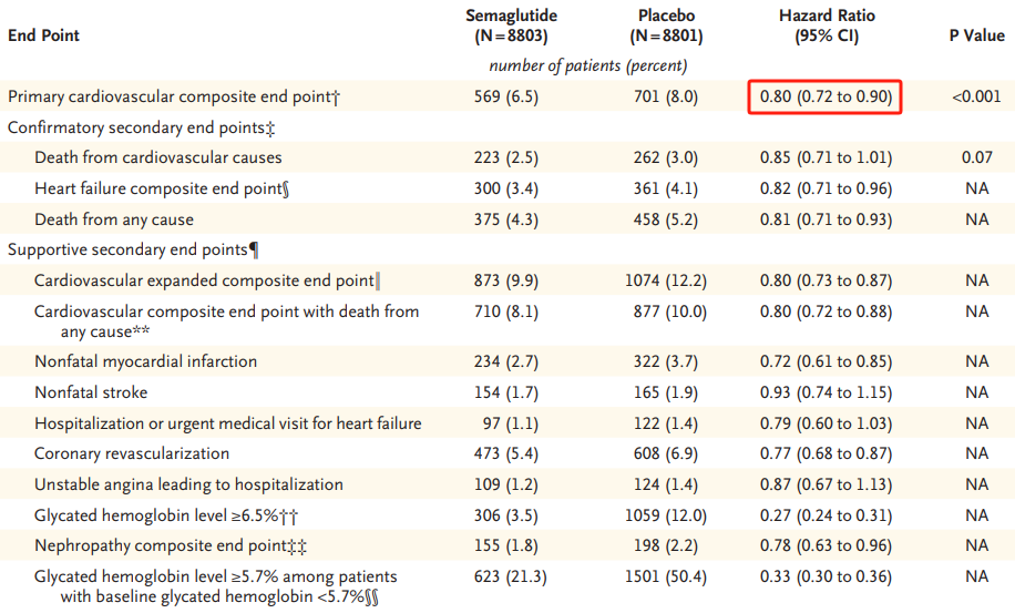 SELECT试验入组17604例有既往心血管疾病肥胖/超重患者,随机分配每周接受一次司美格鲁肽或安慰剂治疗。研究结果显示,与安慰剂相比,2.4mg的司美格鲁肽能在长达五年的时间里将主要不良心血管事件(MACE)风险显著降低20%(p<0.001)。