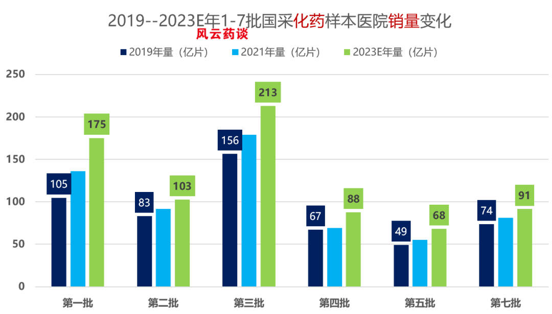 表2:2019年、2021年、2023年1-7批国采化药销量变化(单位:亿片/支)
