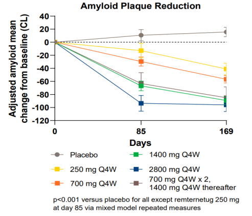 2023 年 3 月,礼来公布了 Remternetug 的 I 期研究中期数据:可有效降低淀粉样蛋白斑块,试验中所有 Remternetug 剂量组都出现了剂量依赖性的淀粉样蛋白减少,在第 169 天 24 例接受治疗的患者中有 18 人实现了淀粉样蛋白清除。