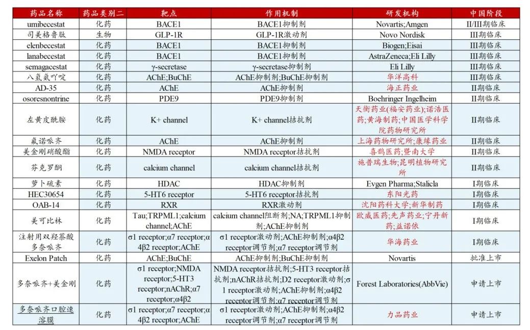 国内治疗阿尔茨海默抑制剂、激动剂类药物进展