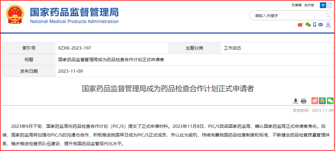 图1 国家药监局正式申请加入PIC/S 图片来源:药监局官网