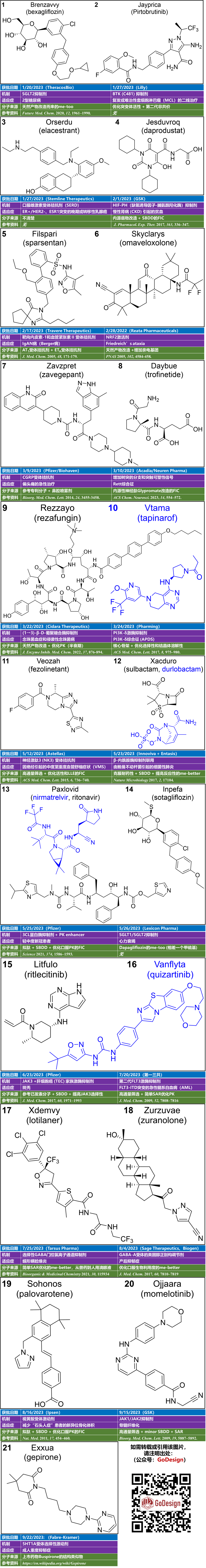 笔者根据美国FDA官网的公开信息,解读2023年Q1-Q3获FDA药物评估和研究中心(CDER)批准上市的小分子药物,并总结了每个药物的分子结构、靶点/机制、研发公司,制作成图表。以下文字内容大多参考自FDA官方的药物说明书和分子结构图底下的参考资料。部分的数据除非特别引用,一般是参考维基百科和药企官方公告。