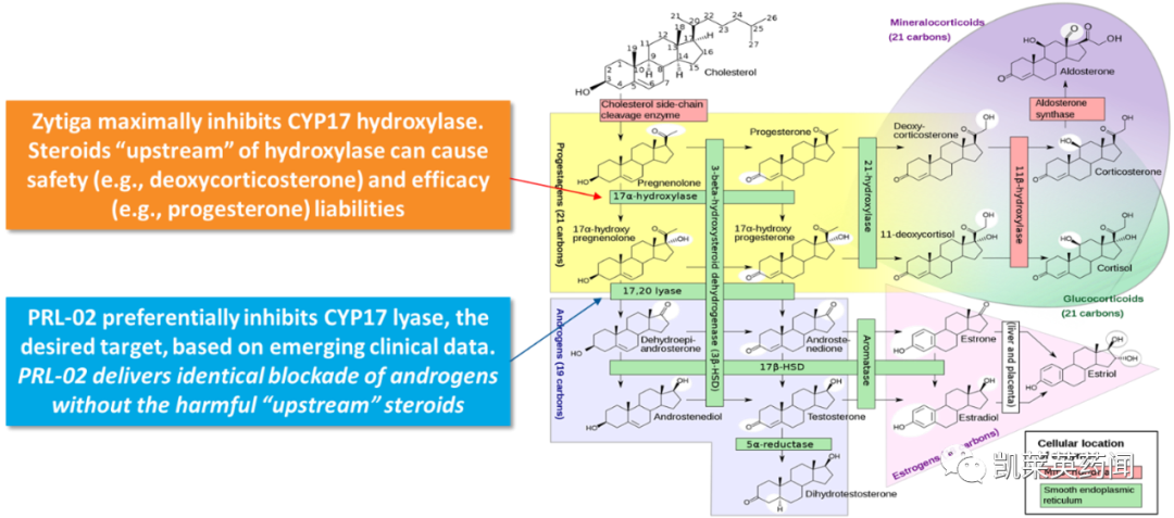 与Zytiga®不同的是,PRL-02 是阿比特龙(Abiraterone,Zytiga®)的一种肌肉注射的新型长效原药,肌注后有望在靶组织中达到高浓度,在靶组织中持续释放活性分子阿比特龙。与现有治疗方案相比,PRL-02 可通过高 CYP17 裂解酶抑制选择性提高疗效和安全性。