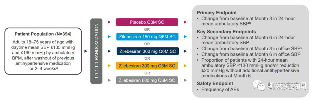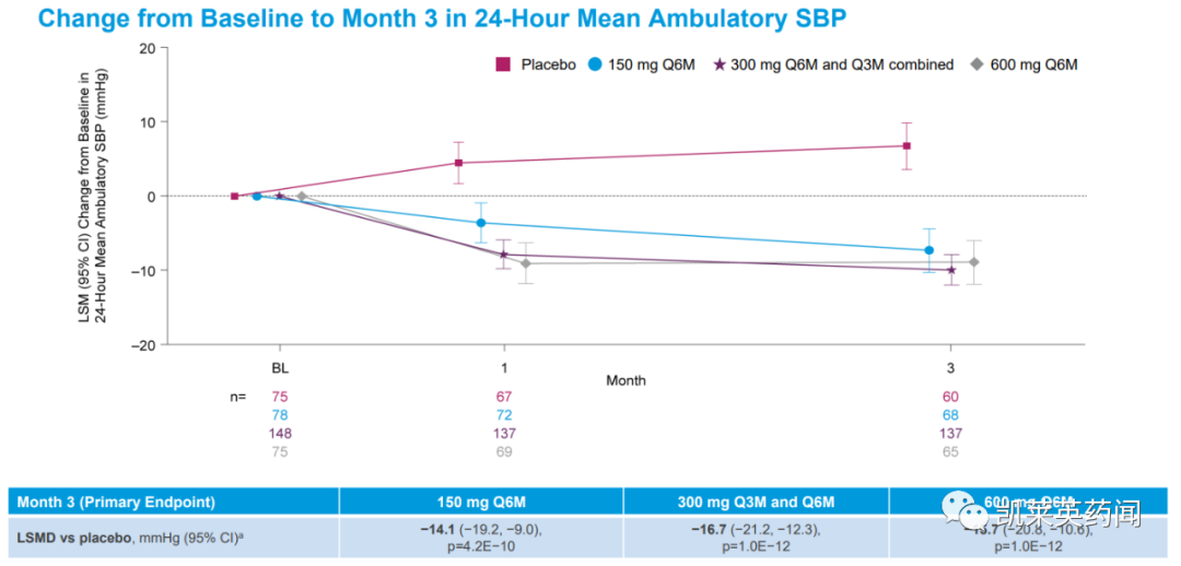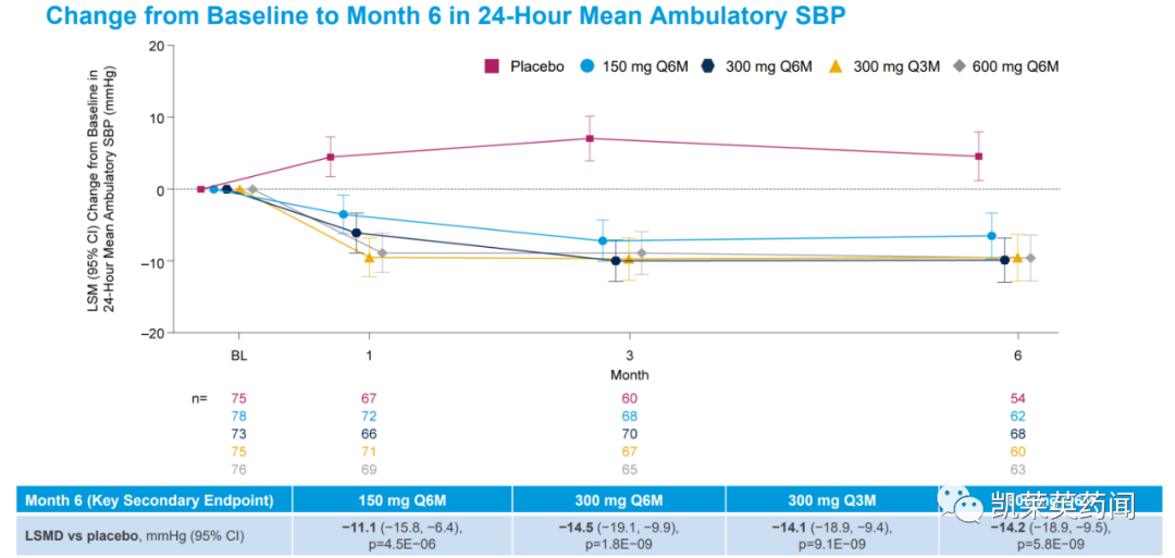 在6个月内持久发挥疗效:在150 mg Q6M、300 mg Q6M、300 mg Q3M和600 mg Q6M剂量组,ABPM测量的24小时SBP分别降低11.1 mmHg、14.5 mmHg、14.1 mmHg和14.2 mmHg(所有p值均小于0.0001)。