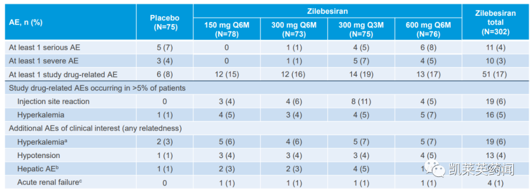 在安全性上,zilebesiran在6个月期间表现出令人鼓舞的安全性。安慰剂组中有 6.7% 的患者报告了严重不良事件,而 zilebesiran 组中有 3.6% 的患者报告了严重不良事件。超过 5% 的患者报告的药物相关不良事件 (AE) 包括 6.3% 的患者发生注射部位反应 (ISR) 和 5.3% 的患者发生高钾血症。没有药物相关的 AE 被分类为严重或严重。