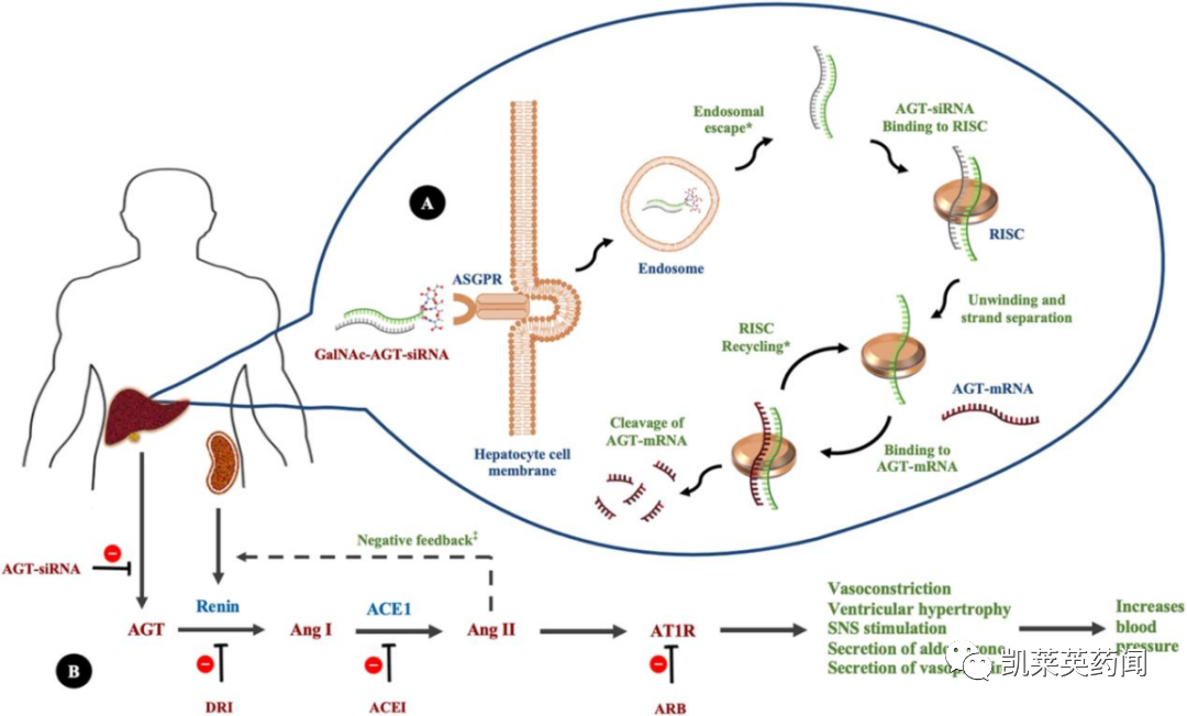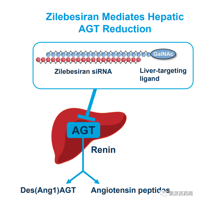 Zilebesiran是一种皮下给药的靶向血管紧张素原(AGT)的研究性RNAi疗法,目前处于2期研究阶段,用于治疗高需求人群的高血压。AGT是肾素-血管紧张素-醛固酮系统(RAAS)的上游前体,RAAS在血压调节中发挥重要作用,抑制AGT具有良好的降压作用。Zilebesiran可抑制肝脏内AGT的合成,从而可能持久减少AGT蛋白,并最终减少血管收缩剂血管紧张素(Ang)ⅱ。