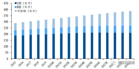 高血压是一种常见慢性病,也是心血管疾病的主要危险因素,以体循环动脉血压(收缩压SBP/舒张压DBP)增高为主要特征,目前诊断标准为在两个不同日期测量SBP 读数≥130mmHg 和/或DBP 读数≥80mmHg。根据WHO 发布的《全球高血压流行趋势综合分析报告》,全球有12.8 亿30-79 岁的成年人患有高血压,其中超过一半患者未获得诊断/对病情不知情,仅20%~30%患者血压得到有效控制。2019年中国高血压的患者人数为3.17亿人,预计于2030年将达到3.88亿人,CAGR为1.85%。