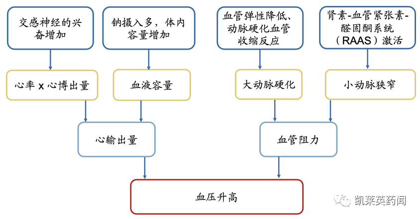 高血压的发病机制复杂,血压的调节主要受到心输出量和外周阻力的影响。交感神经系统兴奋和钠摄入过多会导致心输出量增加;大动脉弹性减弱、僵硬程度增高以及RAAS激活都会增大血管阻力,这些因素都会导致血压升高。