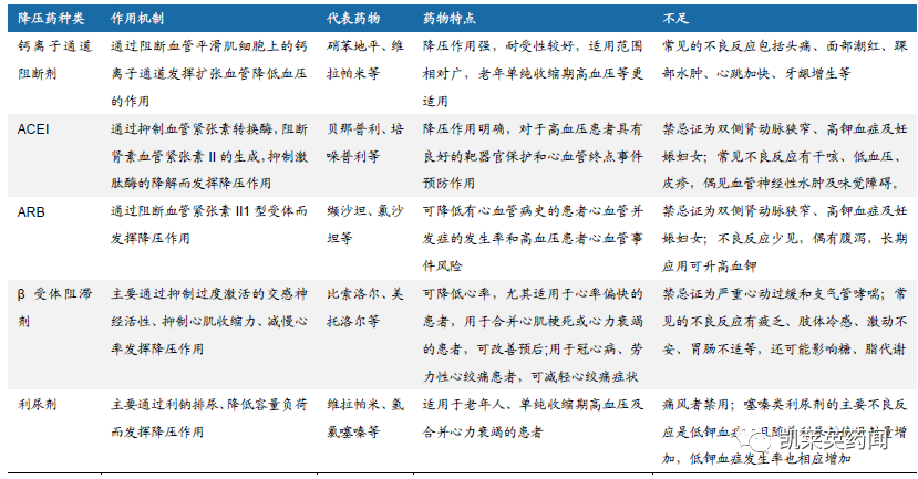 根据高血压不同的发病机制,目前常用的降压药主要有五类,CCB(钙离子通道阻断剂)、ACEI、ARB、β受体阻滞剂和利尿剂。根据《中国高血压防治指南2018年》:(1)常用的五类降压药物均可作为初始治疗用药,并推荐优先使用长效降压药物以平稳控制血压,更有效预防心脑血管并发症发生。(2)根据不同特殊人群的类型及合并症,可以选择针对性的药物,进行个体化治疗。(3)对于高危患者或单药治疗未达标的患者,可以使用降压作用互补的多种药物进行联合治疗。为了将血压降到目标水平,大部分高血压患者需要使用2种或2种以上降压药物,联合治疗目前已成为降压治疗的基本方法。