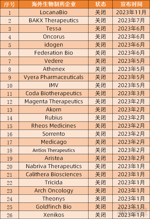 (根据公开报道统计,2023年部分宣布关闭的生物制药企业)