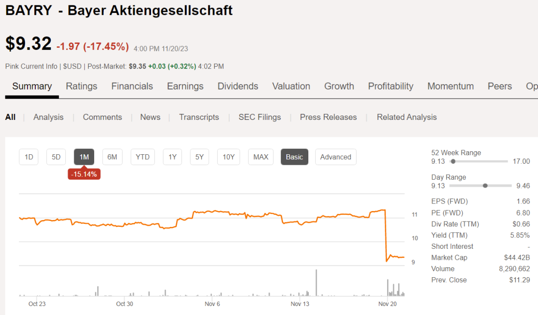 受此消息影响,加上草甘膦致癌诉讼被判罚15.6亿美元,拜耳公司当天股价大跌17%。