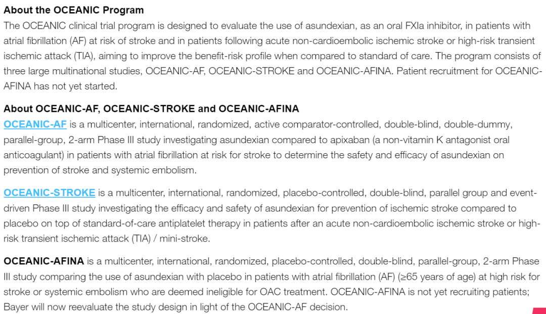 2023年11月19日,拜耳宣布FXIa抑制剂Asundexian治疗房颤三期临床OCEANIC-AF因为劣效于对照组阿哌沙班而被终止。治疗中风的三期临床正常进行。