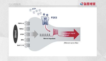 在这一背景下,gefapixant展现出治疗潜力。P2X3受体过度活化后与感觉神经元的超敏有关,损伤或感染引发的呼吸道神经元超敏反应可引起过度、持续和频繁地咳嗽,因而从机制上,拮抗P2X3受体有可能在不涉及中枢神经系统的情况下治疗慢性咳嗽。