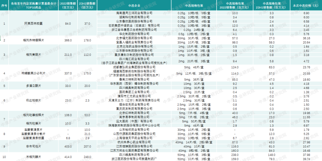 表:各地首年约定采购量计算基数合计TOP10药品中选规格销售情况
