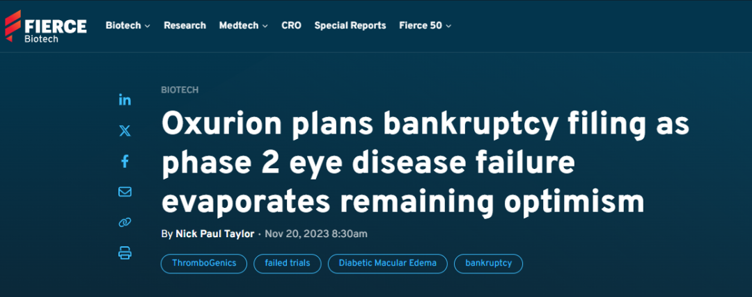 11月20日,据Fierce报道,因眼部疾病疗法THR-149临床II期试验失败,Oxurion已计划申请破产。