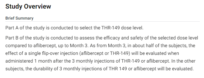 THR-149正在进行的II期临床名为KALAHARI,是一项由两部分组成的随机、前瞻性、多中心试验,旨在评估THR-149作为糖尿病黄斑水肿(DME)患者的潜在治疗方法。