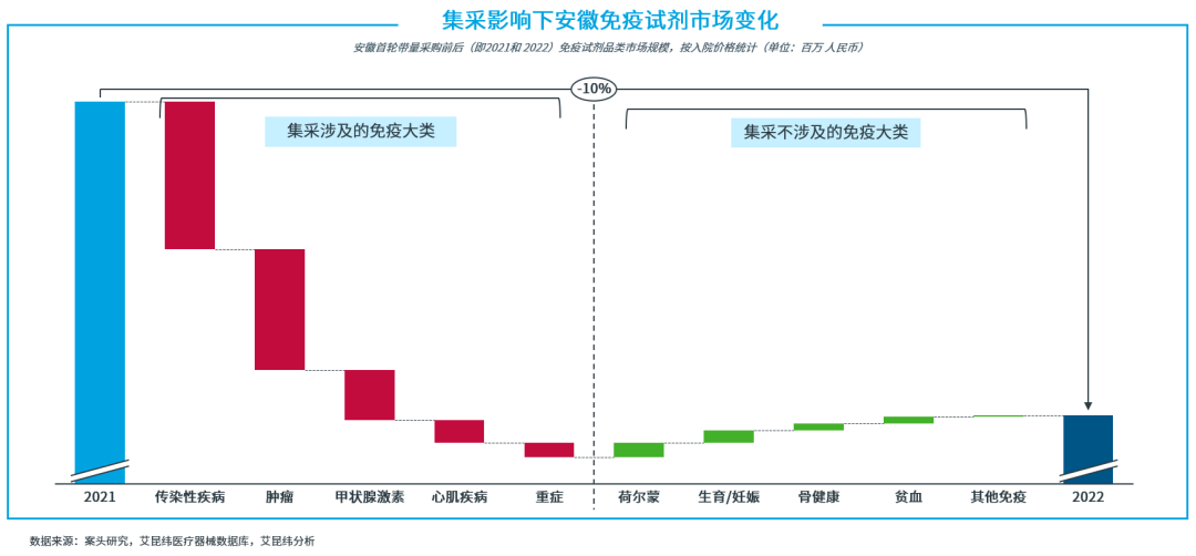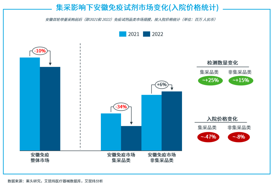 自2021安徽首次对免疫类体外诊断(IVD)检测试剂试行带量采购(VBP)后,多个省市积极参与摸索更多品类、更大范围的体外诊断试剂带量采购。在多方试点探索下,由多种报量机制、分组规则等协同导致的市场格局也发生巨大变化。同时,随着技耗分离等研究的逐渐厘清,VBP将以更快的步伐席卷整个IVD领域。本文将围绕2021至2022年期间安徽省免疫类体外诊断检测试剂入院端的市场规模、免疫检测不同品类增长趋势、IVD厂商竞争格局、单机及流水线检测设备增量等维度来全面复盘本轮集采的影响以及探讨企业如何做好后续集采的应标和执行策略的启示。
