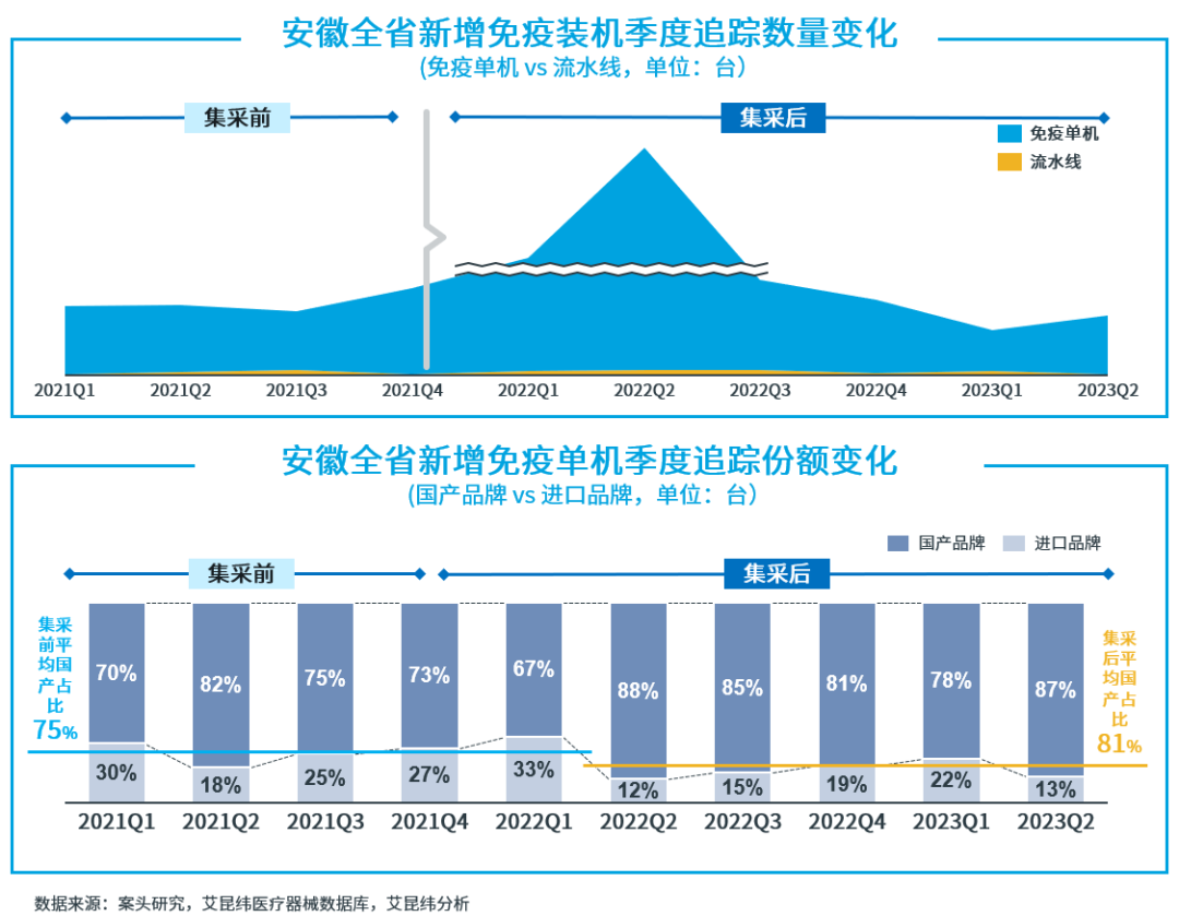 根据IQVIA季度追踪的仪器新增装机数量看,安徽首轮免疫集采引发的装机增量超95%为免疫单机。相较而言流水线的整体装机趋势未产生较大波动,且2/3的新增流水线的份额来自VBP中选厂商。单机的替换基本在集采完成后的6个月内完成,并以此为锚点为后续的上量完成铺垫,同时,国产品牌新增设备的占比也进一步提升: