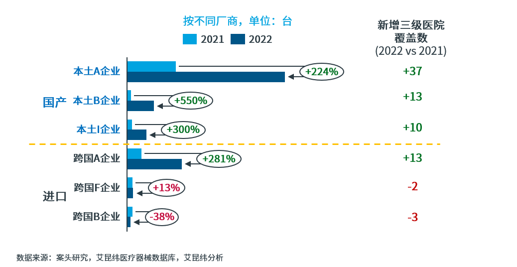 其中,三级医院新增免疫单机数量最为显著,于此同时,国产厂商通过集采有效突破三级医院市场。本土A企业在原有高装机体量的基础上继续迅猛拓展三级医院市场,新拓展37家医院,远高于其他竞争对手;本土B企业则取得了5倍增长,新拓展医院13家;本土I企业第一轮未参与,但随后紧急调整方向、利用企业价格联动参与、共有17项联动后中选项目。相较而言,跨国A企业的重点策略是快速替换跨国E企业在三级医院的单机覆盖;跨国F企业在未中标的情况,2022年仍维持原有新增装机水平,跨国B企业则在中标的情况单机新增装机相对于2021年不增反降,其试剂增长主要通过优势项目甲功的存量客户获取。