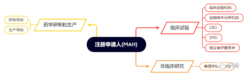 (2)申请人企业对于自己的合规信息可以做到充分收集和保存,但对产品从研发走到临床结束的其他相关方的信息就会缺失。在本文件中是分别介绍了药学研制与生产、药物临床试验、药理毒理学研究三大部分的合规信息内容要求的。因此,与一个要注册申请的药品有关的主体不止申请人企业一家,至少就有下图所示的多个不同角色