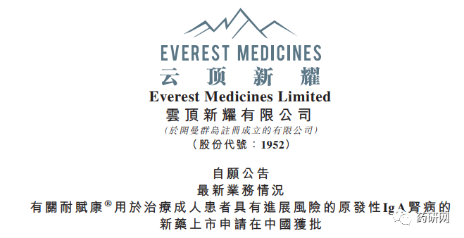 11月24日,云顶新耀公告,中国药监局已批准耐赋康®( Nefecon ® )在中国用于治疗具有进展风险的原发性IgA肾病成人患者的新药上市申请。