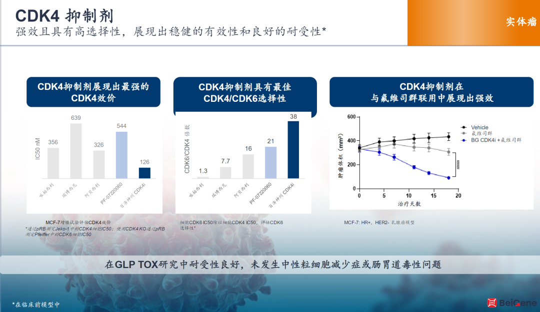 在临床前研究中,百济的 CDK4 抑制剂表现初比辉瑞 PF-07220060 更高的选择性和 CDK4 效价,并在与氟维司群联用中展现初强效。当前,BGB-43395 已经启动 I 期临床。