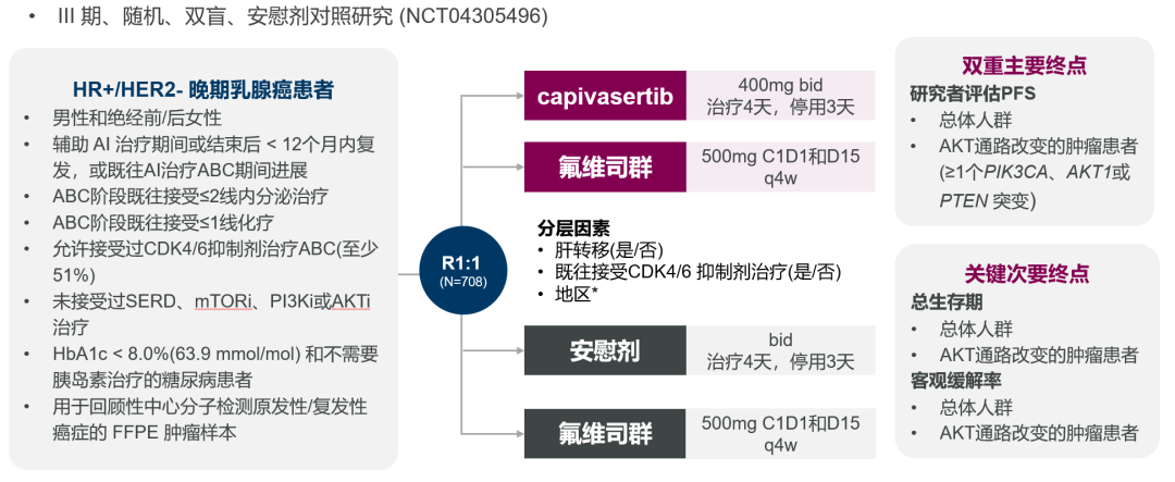 Capivasertib的关键CAPItello-291临床试验研究结果此前发表于《新英格兰医学杂志》(NEJM)。它是一项随机、双盲、安慰剂对照III期临床试验(NCT04305496),旨在评估Capivasertib+氟维司群用于HR+/HER2-晚期乳腺癌的疗效与安全性。该研究共招募708例绝经前/绝经后女性及男性HR+/HER2-晚期乳腺癌患者1:1随机分为Capivasertib+氟维司群组和安慰剂+氟维司群组,其中共289例(40.8%)患者为AKT通路异常,并且489例(69.1%)患者既往在晚期阶段接受过CDK4/6抑制剂治疗。本研究以总人群和伴有AKT通路异常(至少携带一种PIK3CA、AKT1或PTEN基因突变)患者的PFS(研究者评估)作为双重主要研究终点。