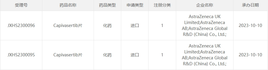 2023年10月,阿斯利康递交的1类新药AKT抑制剂Capivasertib片的上市申请/NDA获NMPA/CDE受理。目前有多项临床试验在中国同时展开。