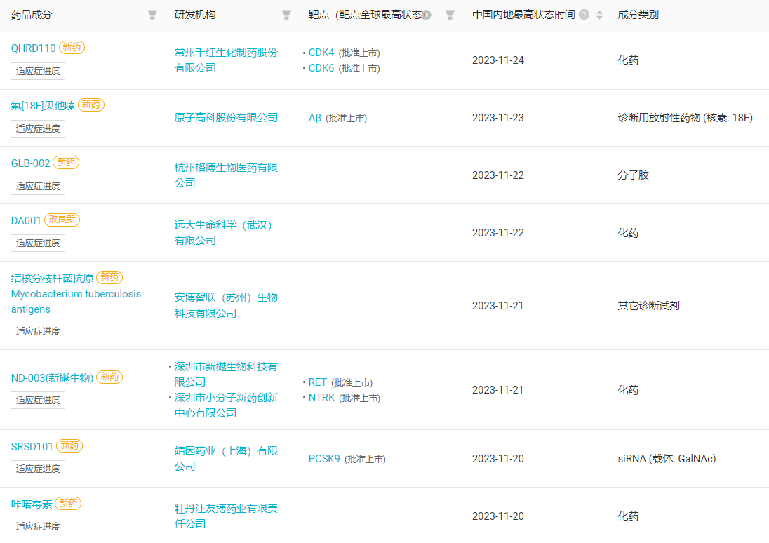 据 Insight 数据库统计,11 月 19 日—11 月 25 日全球共有 46 款创新药(含改良新)研发进度推进到了新阶段,其中 2 款获批上市,5 款申报上市,18 款获批临床,9 款申报临床。