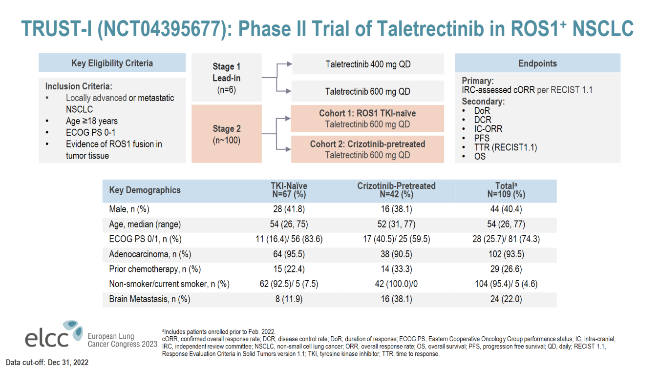 此次 NDA 获受理是基于一项临床 II 期研究 TRUST-I (NCT04395677) 的积极结果。该试验是一项在中国开展的多中心、开放标签、单臂试验,旨在评估泰莱替尼在中国 ROS1 阳性非小细胞癌患者中的的安全性、耐受性和疗效。