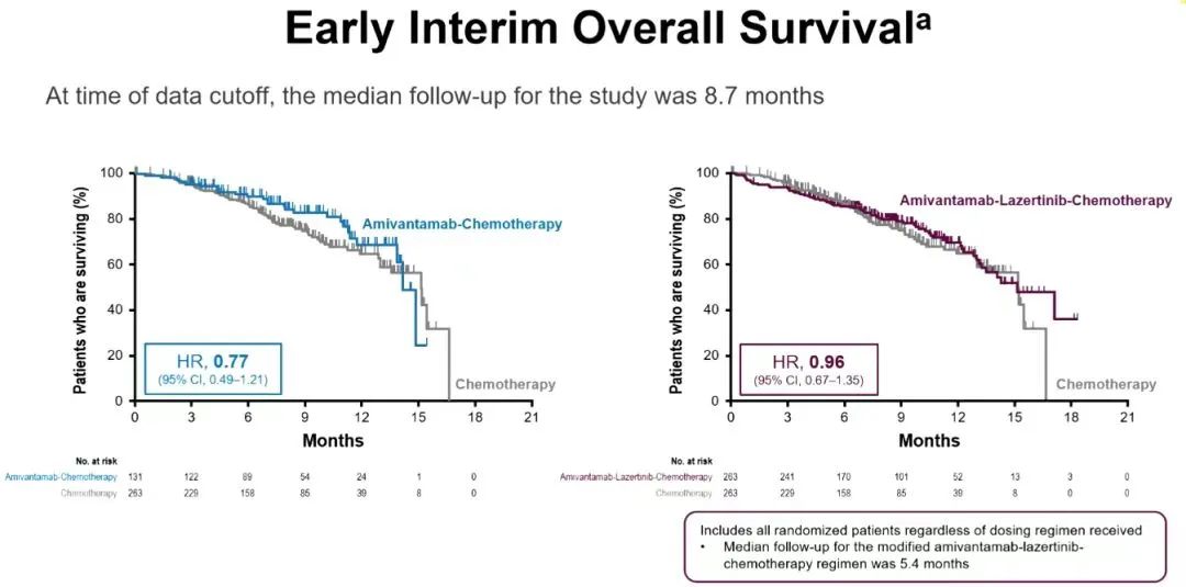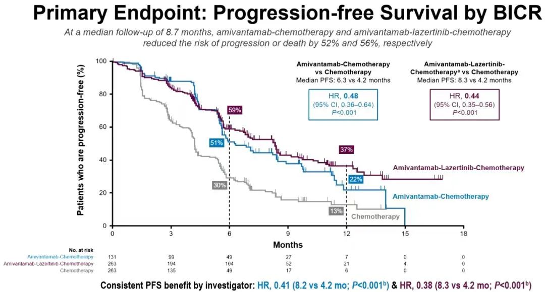 结果显示:中位随访 8.7 个月,相较于化疗组,Amivantamab+化疗组和 Amivantamab+Lazertinib +化疗组可分别显著降低 52% 和 56% 的疾病进展或死亡风险,中位 PFS 分别为 6.3 个月 以及 8.3 个月(vs 化疗组 4.2 个月),1 年 PFS 率分别为 22%、37%(vs 化疗组 13%)。